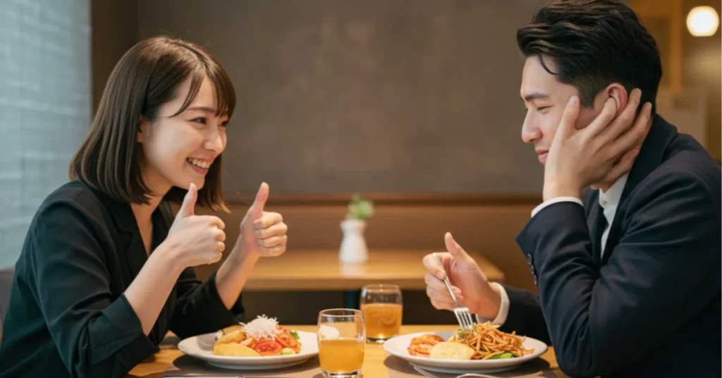 例:「映画好きなんだ」→「いいね!どんなジャンル?僕はアクションが好き」 - 自分の小ネタを混ぜる